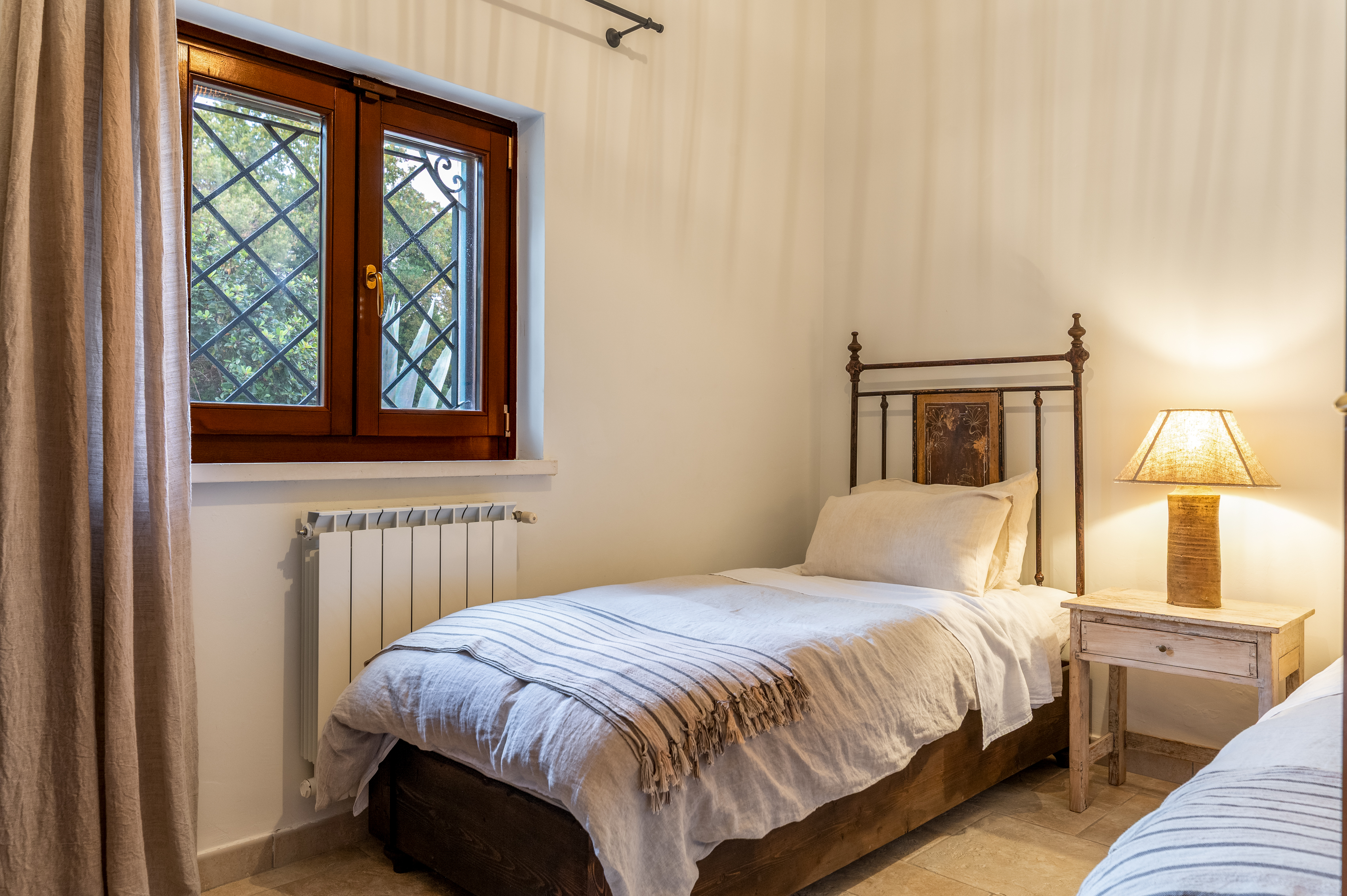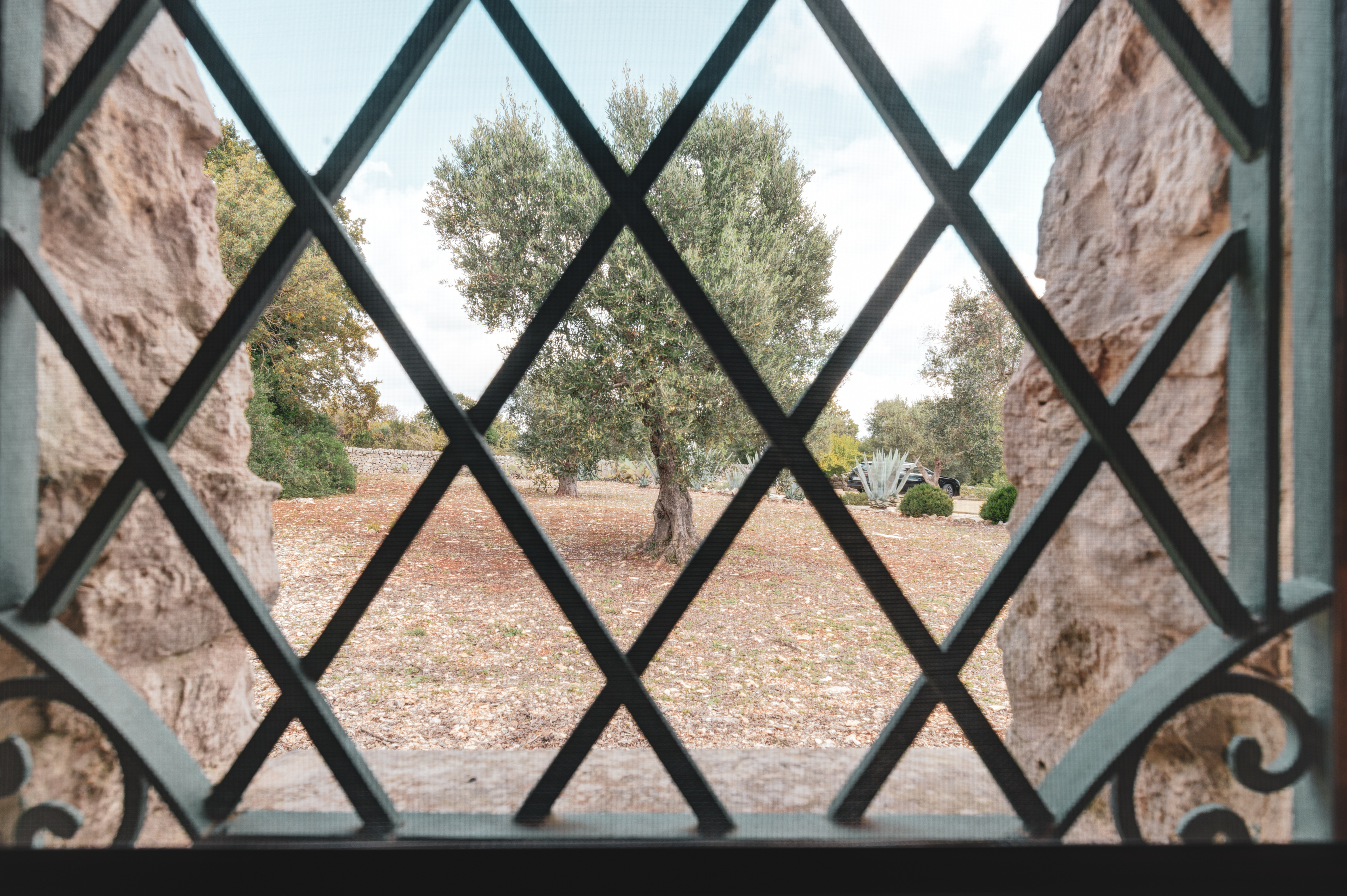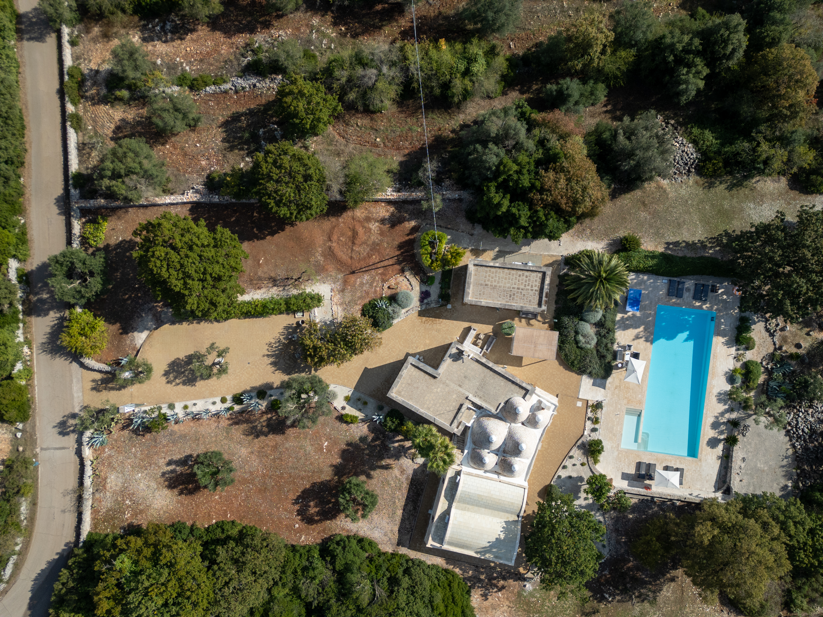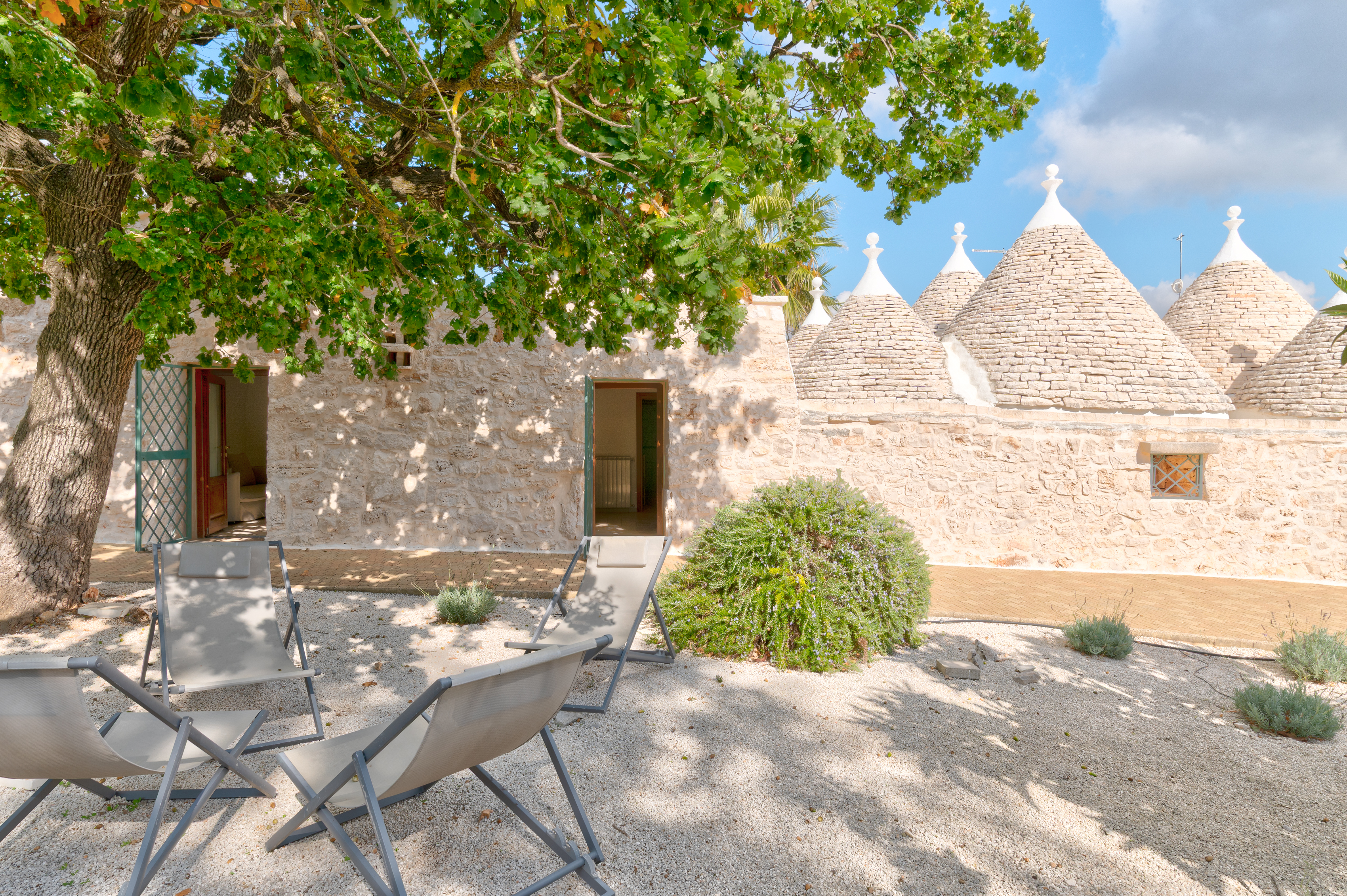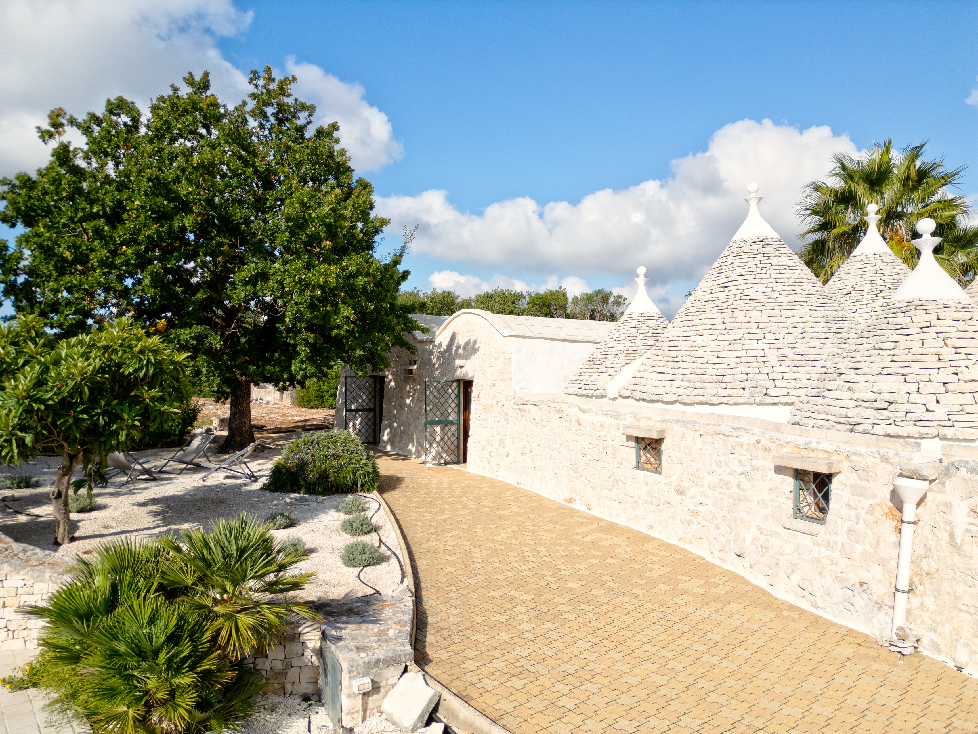 Tucked away, surrounded by 20 acres of olive groves and rambling fruit orchards, deep within the Valle d’Itria is Trullo Trazzonara. This magnificent trullo complex has been lovingly restored using ancient stone masonry techniques to showcase its original charm and character with luxury ameneties. Ideal for families and larger groups of friends, the property sleeps up to 14 people, as it consists of a tastefully furnished 6 cone trulli main house with four double bedrooms and two bathrooms, 2 attached lamie double bedrooms with en-suite bathrooms with showers and a separate villetta with living room/kitchenette, double bedroom and en-suite bathroom with shower over the bath tub, giving all members of the family or group their own space. Between the trulli and the villetta is a stone patio with shaded terrace, dining table, chairs and adjacent barbecue for cooking and enjoying meals al fresco. Within the extensive outside space is a large, 18 x 7 metre (60 ft x 23 ft), infinity edge private swimming pool with a 4 metre children’s dipping pool. Lovely shaded drystone walled travertine terraces and patios with padded stone seats, outdoor shower, sun loungers and umbrellas transform the garden and pool area into splendid open-air lounges, creating an enchanting place to relax. Fully explore the picturesque Puglia region by walking or cycling through its rural landscape dotted with whitewashed hill towns or head to the coast to enjoy sandy beaches. Popular towns to visit close to the house include Martina Franca, Ceglie Messapica, Ostuni and Locorontondo. These are all within a 30 minute drive, as are the beaches such as at Savelletri and Villanova. Trullo Trazzonara is located in a quiet country lane that leads up to Monte Trazzonara, so the area benefits from a gentle breeze year round, making it a pleasant place to unwind, even in the hottest summer months.