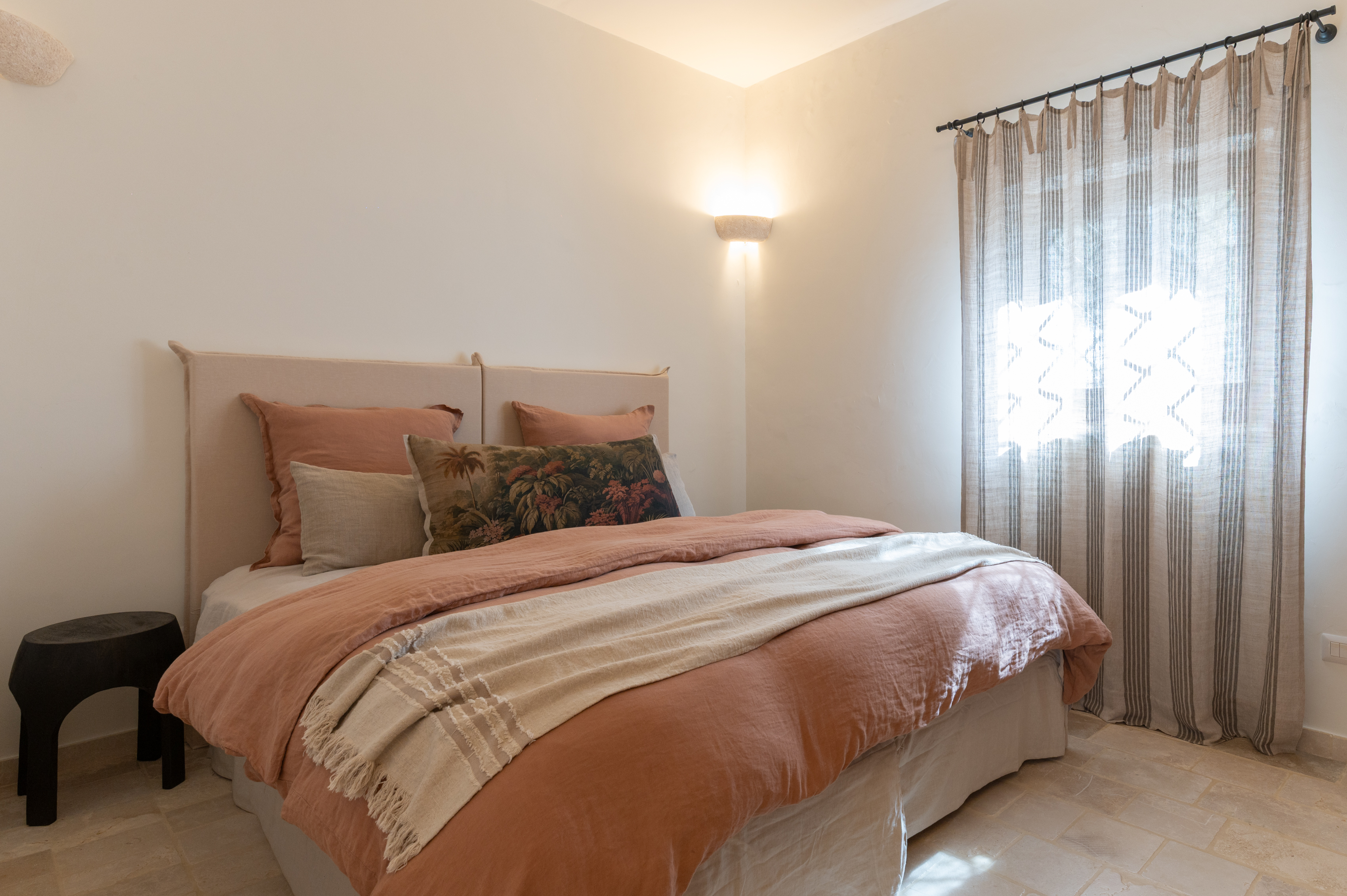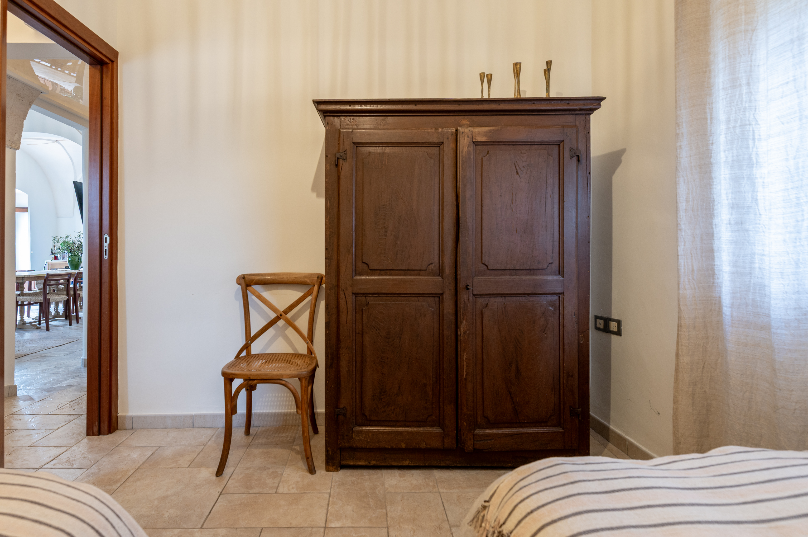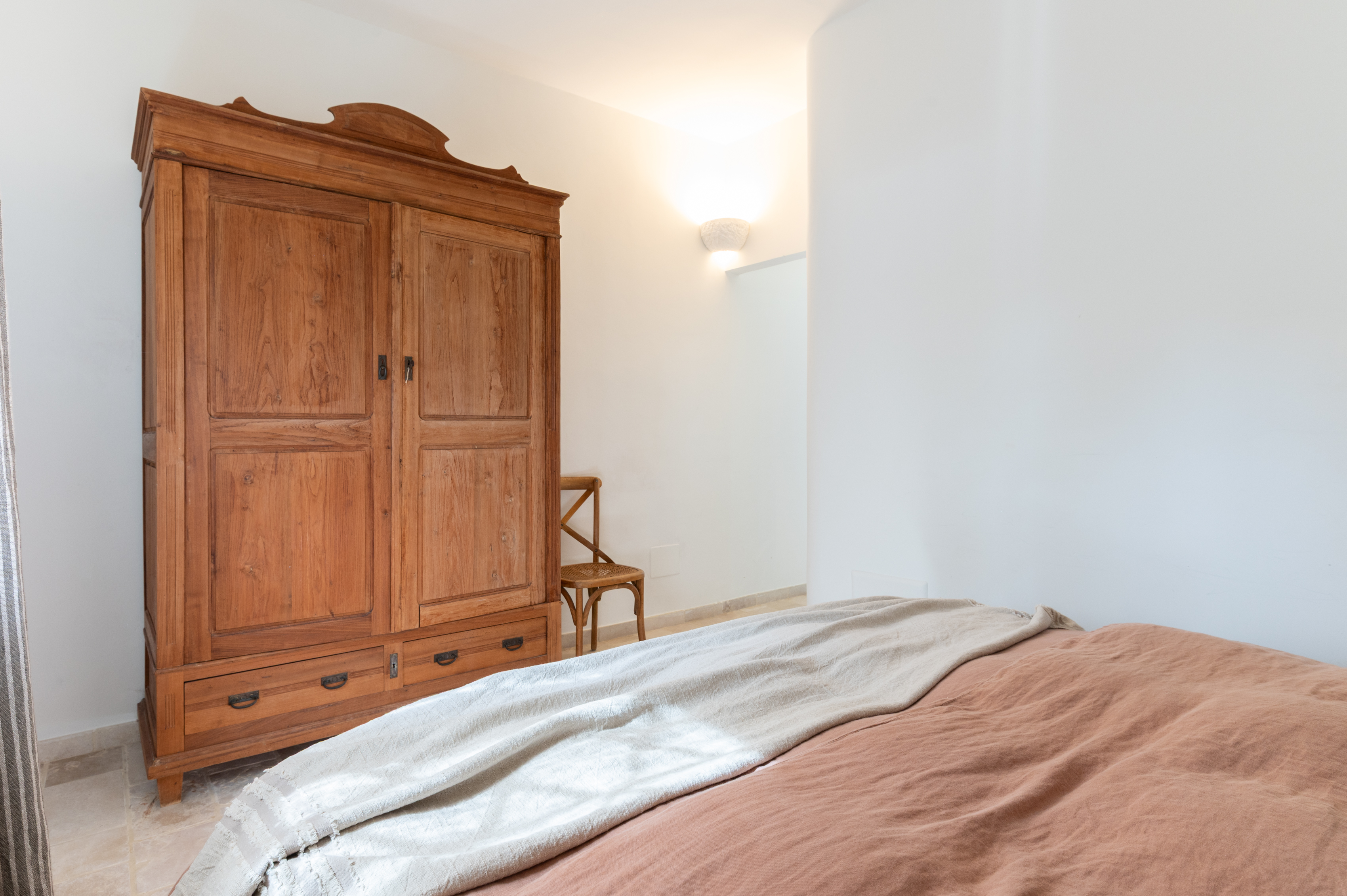 Situated under a large trullo cones this comfortable double bedroom with window overlooking the pool has a wardrobe with plenty of hanging space, bedside table with lamps and a small chest of drawers
