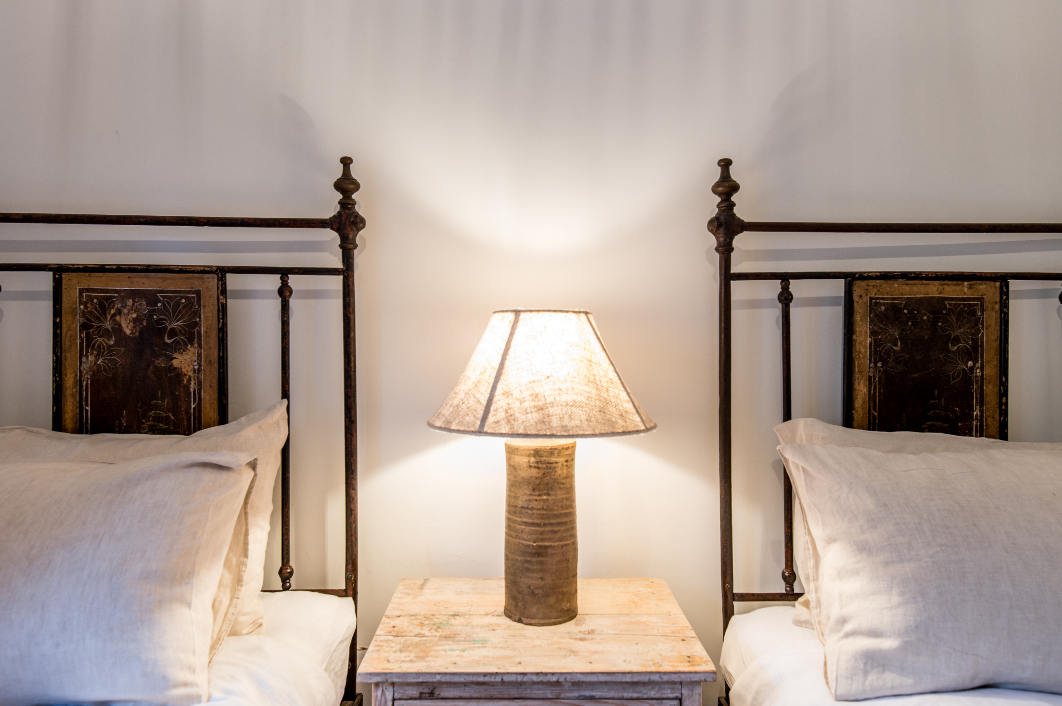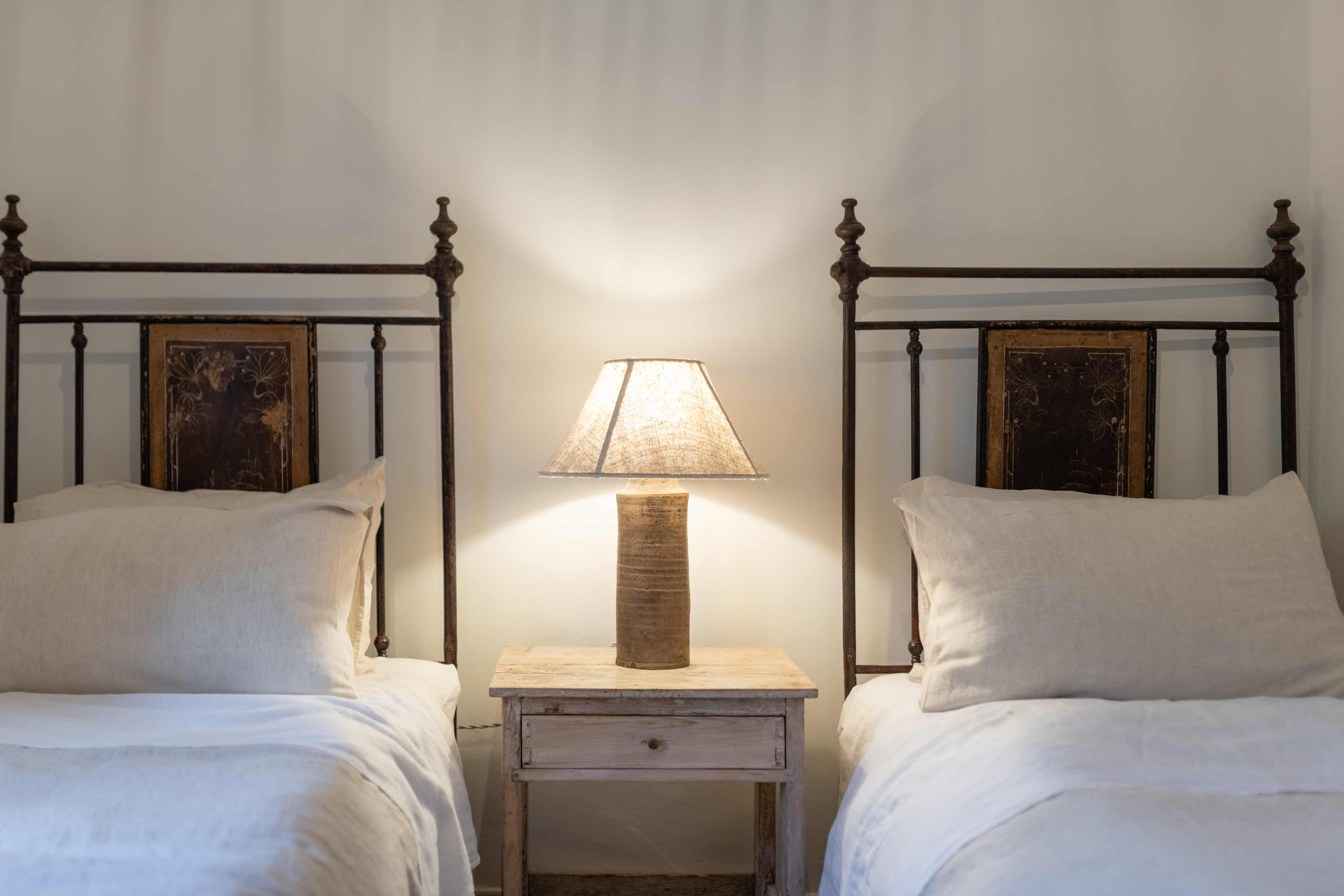This room is furnished with 2 beautifully restored antique single beds, bedside table and lamp nearby with a large wardrobe.